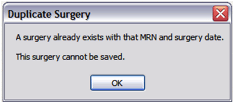 of MRN and surgery date. If the user creates a new surgery with the same MRN